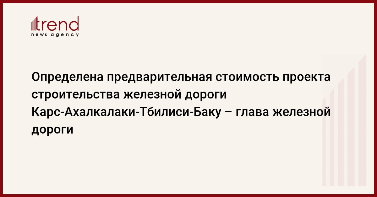 Азербайджан, Грузия и Турция утвердили предварительную стоимость проекта железнодорожного сообщения по маршруту Карс-Ахалкалаки-Тбилиси-Баку. Как передает Trend , сегодня руководитель азербайджанской государственной железной дороги Ариф Аскеров заявил, что предварительная стоимость проекта составляет $422 млн.