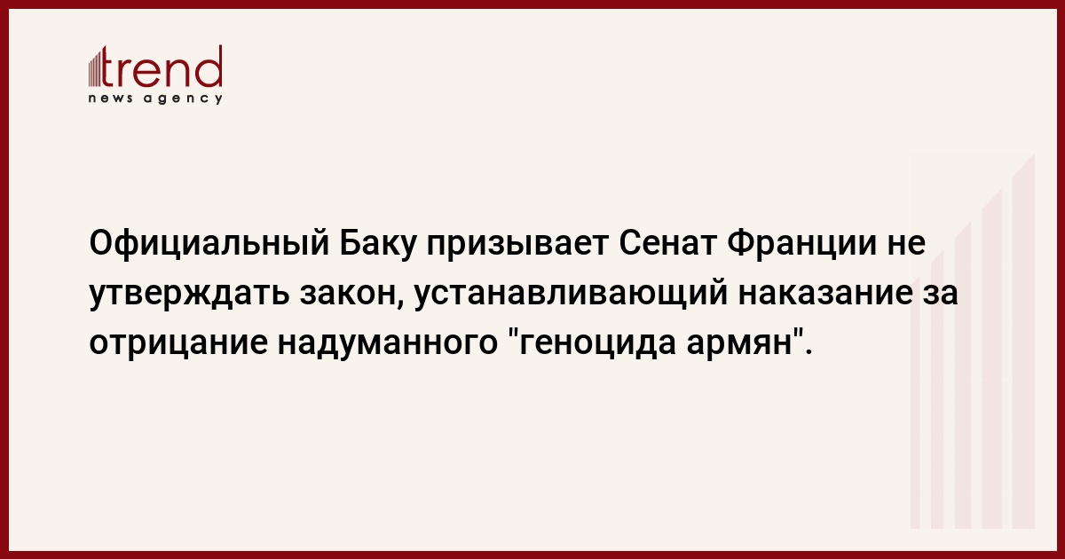 Принимая во внимание, что правительство Франции не согласно с этим законодательным актом, мы выражаем надежду, что Сенат Франции в полном соответствии с выраженным международной общественностью интересом в создании новой атмосферы безопасности, стабильности и взаимного доверия в важном стратегическом регионе Европы предотвратит этот негативный шаг, заявляет МИД Азербайджана.