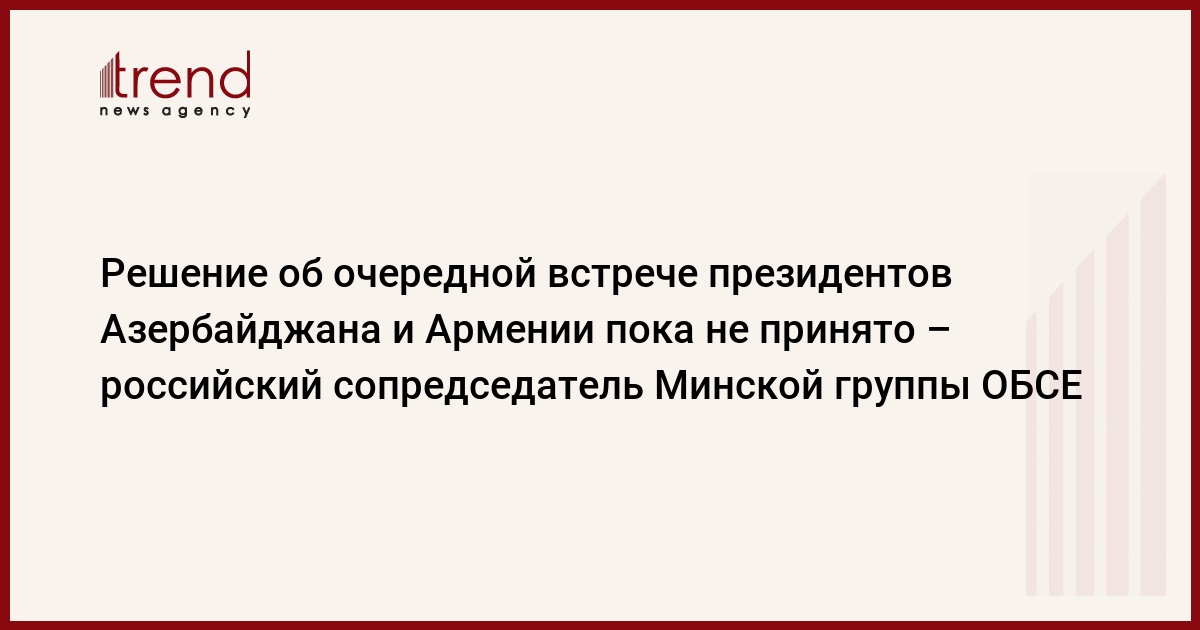 Решение об очередной встрече президентов Азербайджана и Армении пока не принято. Об этом в интервью Trend 2 ноября сообщил российский сопредседатель Минской группы (МГ) ОБСЕ Юрий Мерзляков, комментируя сообщения о возможной встрече президентов в рамках намеченного на 28 ноября саммита СHГ.