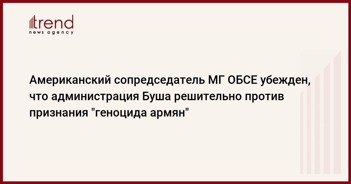 Сопредседатель Минской Группы ОБСЕ от США Мэтью Брайза (Mattew Bryza) убежден, что администрация Джорджа Буша решительно против принятия любого закона, ставящего целью признать так называемый "геноцид армян".