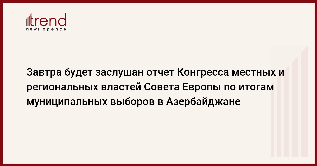 Завтра утром в Москве, на осенней сессии Конгресса местных и региональных властей Совета Европы, будет заслушан отчет по итогам муниципальных выборов в Азербайджане. Об этом сообщила Trend вице-президент Конгресса Людмила Сфирлоага, которая сама выступит с данным отчетом.