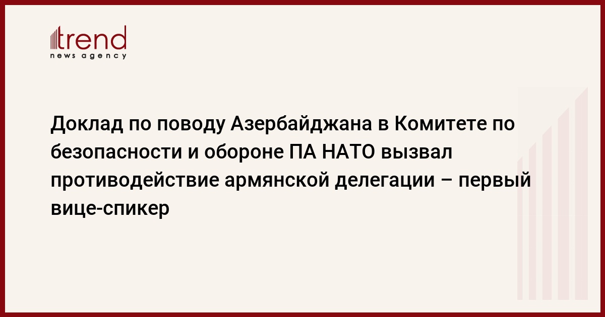 На осенней сессии Парламентской ассамблеи НАТО доклад по поводу Азербайджана в Комитете по безопасности и обороне вызвал противодействие армянской делегации. Как передает Trend , об этом журналистам заявил первый вице-спикер Милли меджлиса Азербайджанской Республики, руководитель делегации Милли меджлиса в Парламентской ассамблее НАТО Зияфет Аскеров.