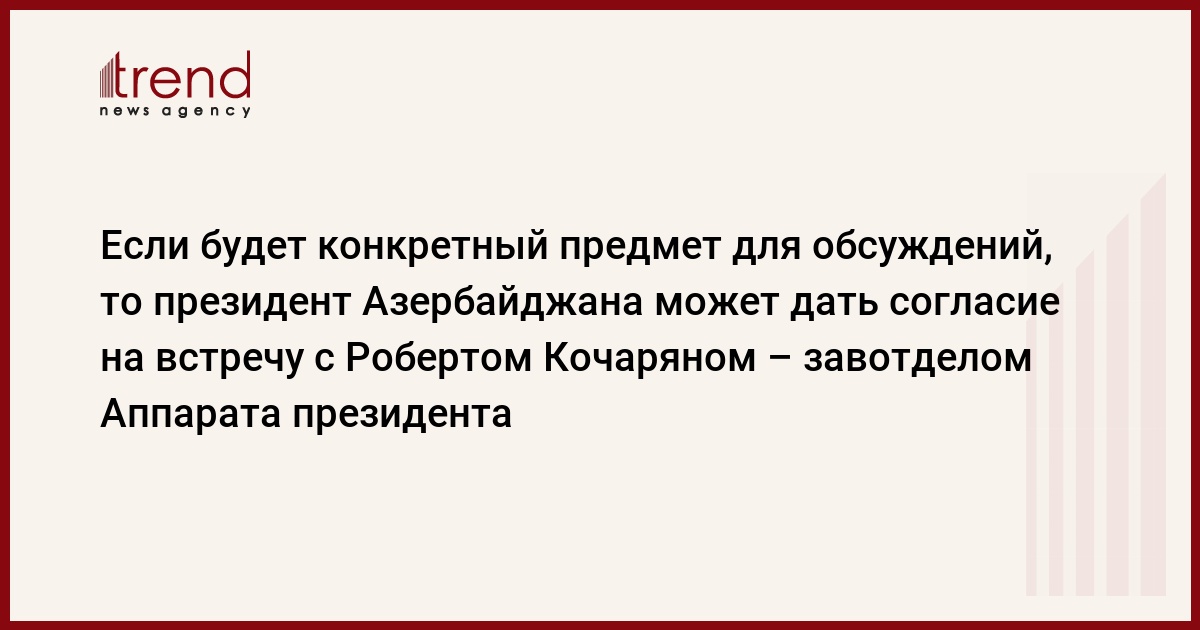 Если будет конкретный предмет для обсуждений, то президент Азербайджана Ильхам Алиевым даст согласие на встречу с президентом Армении. Об этом, как передает Trend , 22 ноября сообщил журналистам заведующий отделом внешних связей исполнительного аппарата президента Азербайджана Новруз Мамедов.