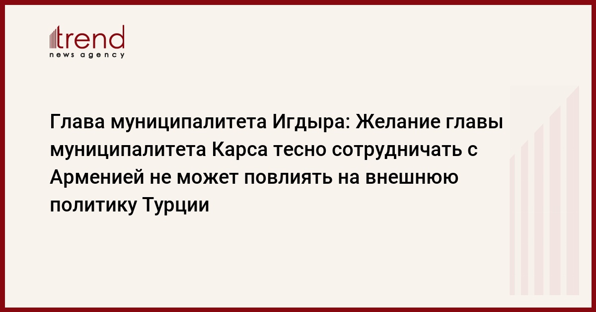 Желание главы муниципалитета Карса тесно сотрудничать с Арменией не может повлиять на внешнюю политику Турции. Как передает Trend об этом 30 ноября журналистам сообщил глава муниципалитета Игдыра Нуреддин Арас, находящийся с визитом в Азербайджане.