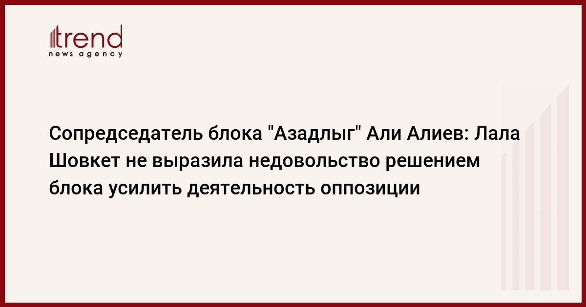 "Лала Шовкет не выразила недовольство тем, что блок "Азадлыг" не принял ее предложение о приостановлении деятельности оппозиции. Так как она пришла к решению, что если предложение блока будет принято и выполнено всеми оппозиционными силами, то тогда будет эффект". Об этом Trend сообщил соучредитель политического блока "Азадлыг", председатель Партии граждан и развития Али Алиев.