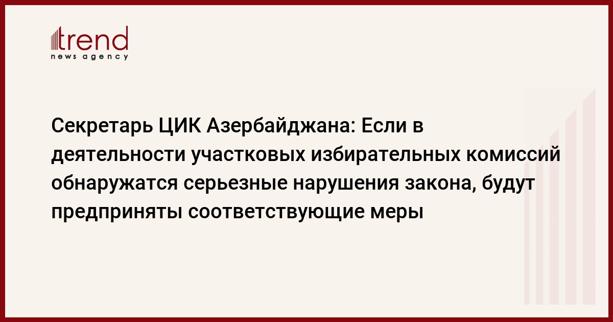Если в ходе мониторингов Центральная избирательная комиссия обнаружит в деятельности участковых избирательных комиссий серьезные нарушения закона, будут предприняты соответствующие меры. Об этом Trend сообщил секретарь ЦИК Натик Мамедов.