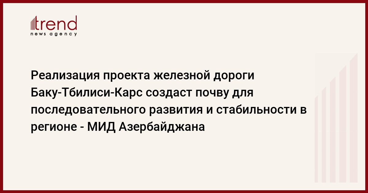 Реализация проекта строительства железной дороги Баку-Тбилиси-Карс создаст почву для последовательного развития, стабильности и повышения благосостояния в регионе. Об этом, как передает Trend , говорится в сообщении министерства иностранных дел Азербайджана относительно достигнутых на днях в Тбилиси соглашений о реализации проекта строительства железной дороги между правительствами Азербайджана, Грузии и Турции.