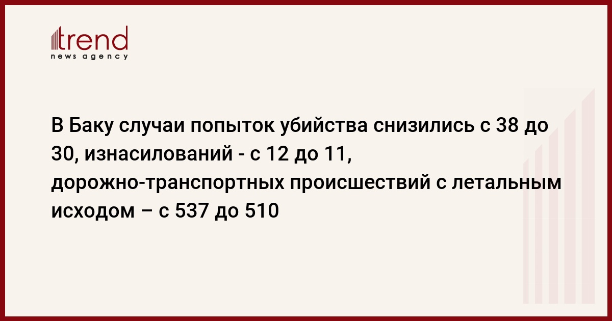 В Баку случаи попыток убийства снизились с 38 до 30, изнасилований - с 12 до 11, дорожно-транспортных происшествий с летальным исходом - с 537 до 510. Как передает Trend , об этом 18 января на оперативном заседании Главного управления полиции Баку (ГУПБ), посвященному мерам по обеспечению общественного порядка и борьбе с преступностью, сообщил начальник ГУПБ генерал-лейтенант Магеррам Алиев.