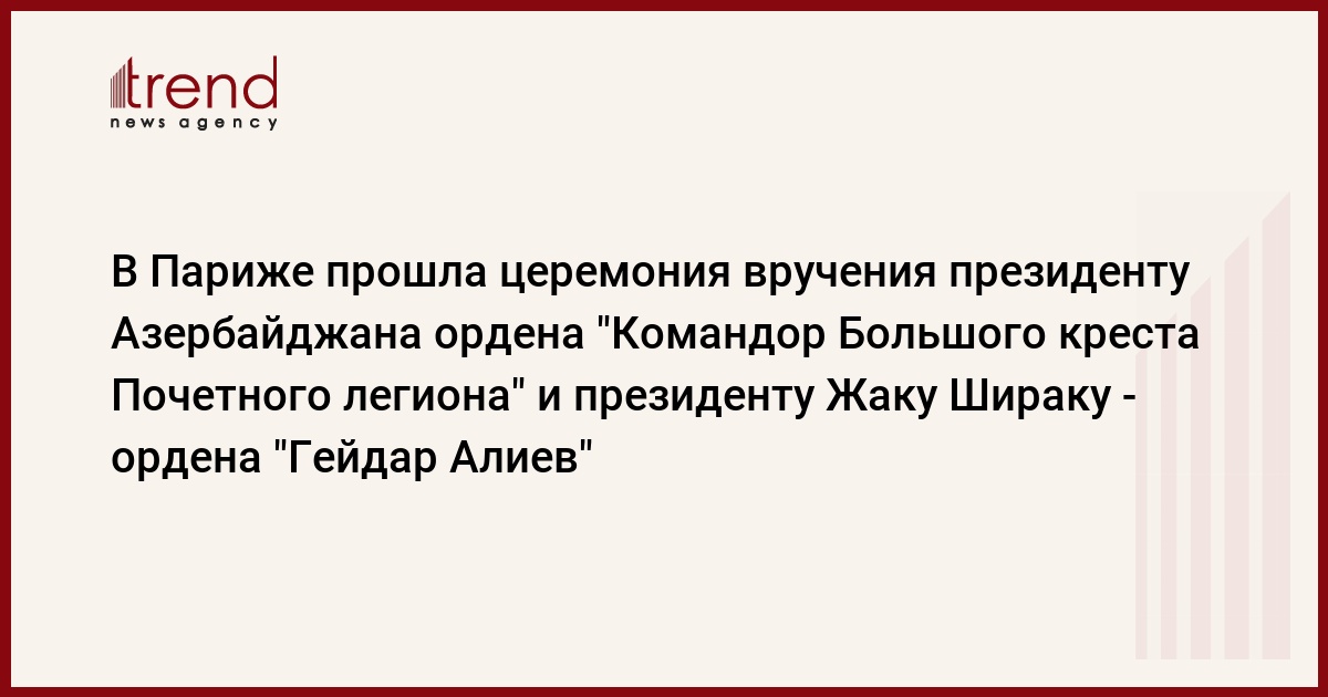 29 января в Елисейском дворце состоялась церемония вручения ордена "Командор Большого креста Почетного легиона" президенту Азербайджана Ильхаму Алиеву и ордена "Гейдар Алиев" - президенту Жаку Шираку, передает Trend .