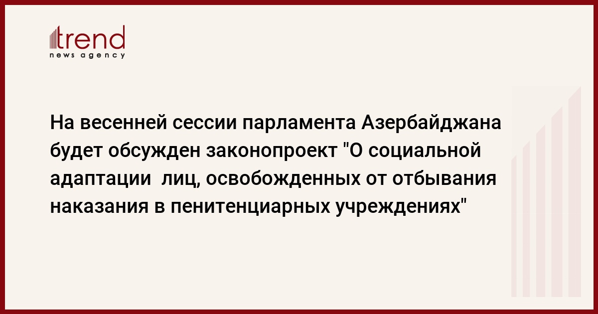 На весенней сессии Милли меджлиса будет обсужден законопроект "О социальной адаптации лиц, освобожденных от отбывания наказания в пенитенциарных учреждениях". Об этом Trend сообщила член комиссии Милли меджлиса по социальной политике, депутат Эльмира Ахундова.