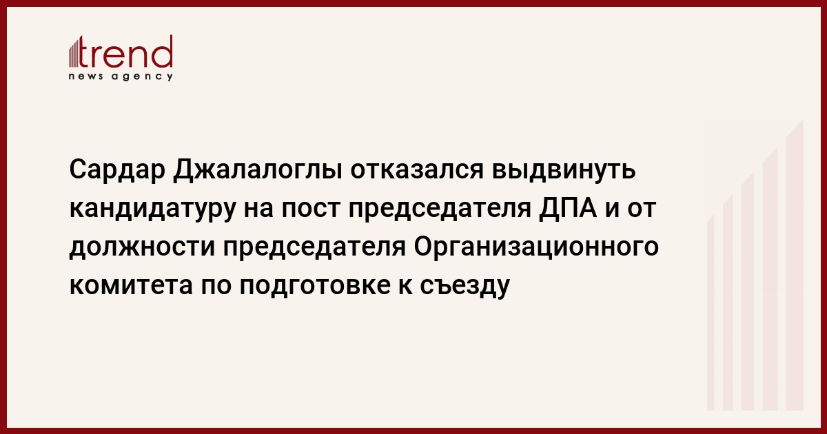 Первый заместитель председателя ДПА Сардар Джалалоглы отказался от выдвижения кандидатуры на пост председателя ДПА и от должности председателя Организационного комитета (ОК) по подготовке к 9-му съезду ДПА. Как передает Trend , об этом 14 февраля С. Джалалоглы заявил на заседании Совета председателей блока "Азадлыг".