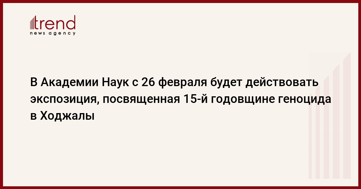 Азербайджан, Баку /корр. Trend М.Керимова / 26 февраля, объявленного Милли Меджлисом Днем геноцида в Ходжалы, в выставочном зале Национальной Академии наук (НАН) Азербайджана состоится открытие экспозиции, посвященной 15-й годовщине трагической даты. Как сообщили организаторы экспозиции, в нее вошло более ста экспонатов. Среди немало новых изданий, которые еще не вошли в фонды Центральной научной библиотеки Академии наук.