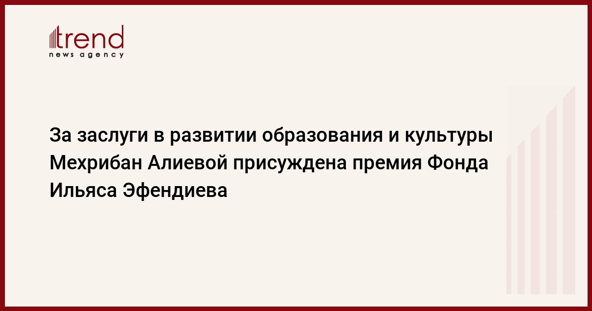 Азербайджан, Баку /корр. Trend С.Агаева/ Литературно-Художественный благотворительный фонд имени Ильяса Эфендиева объявил имена обладателей премий трех номинаций, присужденных фондом. Как сообщили в фонде, решением премиальной комиссии под председательством академика Национальной академии Наук Азербайджана Бекира Набиева, посол Доброй Воли UNESCO , депутат Милли Меджлиса Азербайджана, президент Фонда Гейдара Алиева Мехрибан Алиева удостоена премии фонда в номинации "За заслуги в развитии образования и культуры".