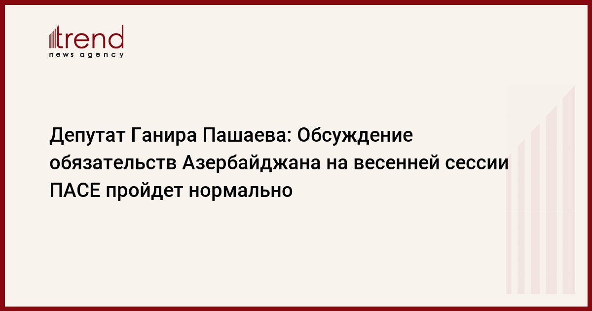 Азербайджан, Баку /корр. Trend И.Ализаде/ Слушания на весенней сессии Парламентской ассамблеи Совета Европы (ПАСЕ), касательно исполнения обязательств, взятых на себя Азербайджаном, пройдут нормально. Об этом в пятницу в Баку заявила депутат Милли Меджлиса, член азербайджанской делегации в ПАСЕ Ганира Пашаева. Она заявила, что Азербайджан является страной, находящейся под мониторингом.