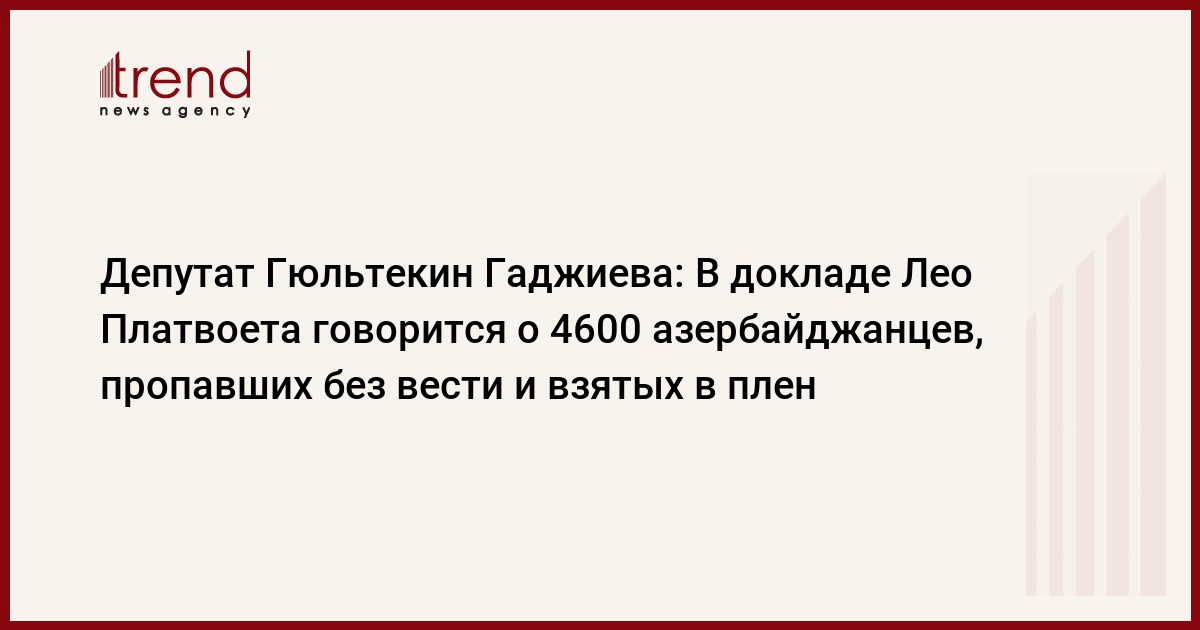 Азербайджан, Баку /корр. Trend И.Ализаде/ В докладе Парламентской ассамблеи Совета Европы (ПАСЕ) о военнопленных, заложниках и лицах, пропавших без вести на Южном Кавказе говорится, что подобная участь постигла 4600 азербайджацев. Об этом в среду в Баку сообщила заместитель главы парламентской делегации Азербайджана в ПАСЕ Гюльтекин Гаджиева.