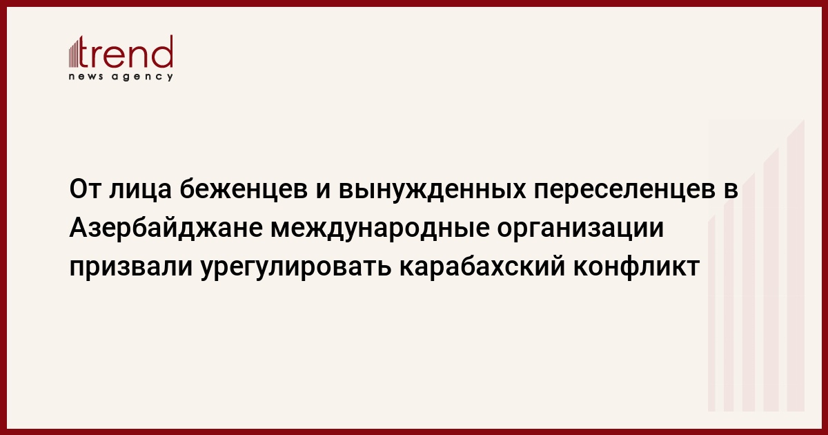 Азербайджан, Баку/корр. Trend С.Ильхамгызы/По случаю Международного дня беженцев Общественное объединение защиты прав мигрантов и вынужденных переселенцев в Азербайджане обратилось в ООН, Парламентскую ассамблею Совета Европы, к председателю ОБСЕ и главам государств-сопредседателей Минской группы ОБСЕ. Отметим, что 20 Июня объявлен Международным днем беженцев на основе специальной резолюции Генеральной ассамблеи ООН от 4 декабря 2000 года.
