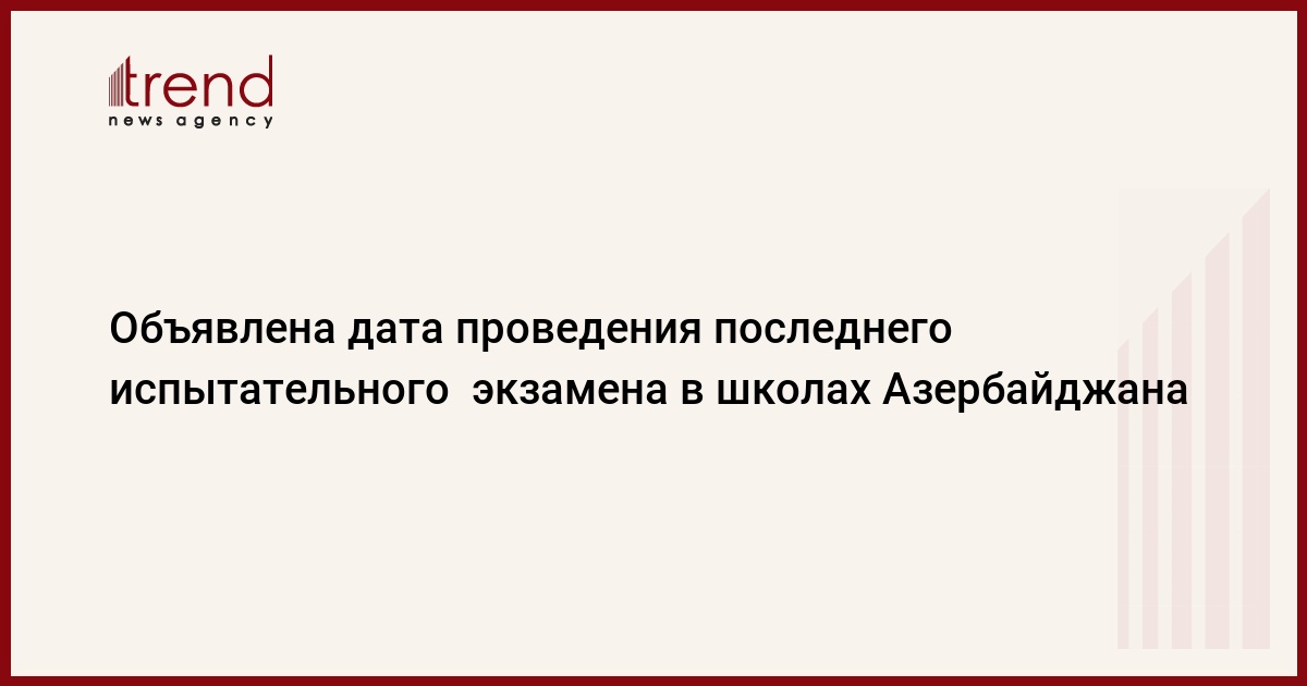 Азербайджан, Баку, 7 марта /корр. Trend Дж.Бабаева/ Последние испытательные централизованные экзамены в текущем учебном году в средних школах Азербайджана пройдут 6 июня. Об этом в пятницу в Баку журналистам сообщил министр образования Мисир Марданов.