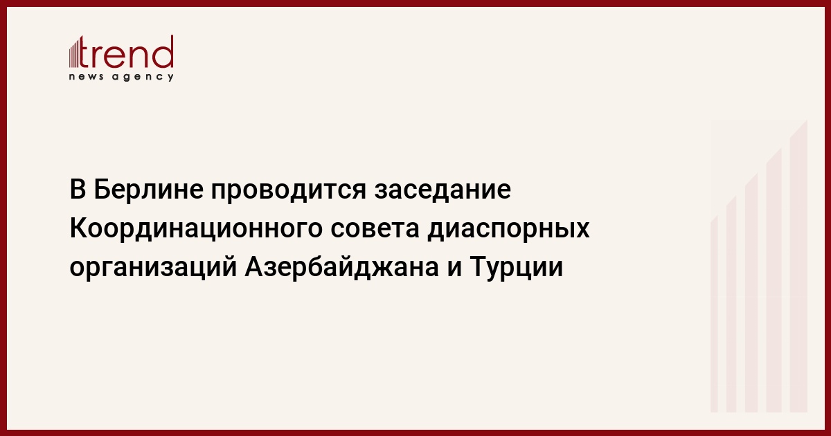 Азербайджан, Баку, 27 марта /корр. Trend С.Ильхамгызы/ Сегодня в столице Германии Берлине проходит заседание Координационного совета диаспорных организаций Азербайджана и Турции. Мероприятие организовано в соответствии с Бакинской Декларацией, принятой 9 марта 2007 года в Баку на первом Форуме руководителей диаспорных организаций Азербайджана и Турции. Целью заседания является определение предстоящих задачи в сфере развития сотрудничества между азербайджанскими и турецкими диаспорами, обсуждение новых методов и технологий о доведении до сведения мировой общественности истин об истории и современной жизни наших народов.