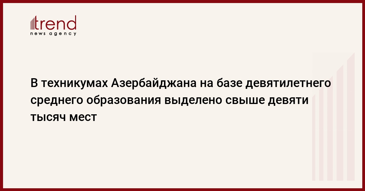 Азербайджан, Баку, 1 августа /корр. Trend Дж.Бабаева/ В техникумах Азербайджана на базе девятилетнего среднего образования выделено свыше девять тысяч плановых мест