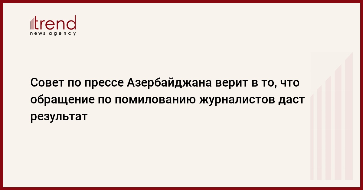 Азербайджан, Баку, 28 августа /корр. Trend Т.Алиев/ Совет по прессе Азербайджана надеется на помилование арестованных журналистов. "Совет по прессе адресовал президенту просьбу о помиловании журналистов и надеется, что обращение не останется без внимания", - сказал находящийся с визитом в Турции председатель Совета по прессе Афлатун Амашев, в ходе встречи с председателем Совета по прессе этой страны и Всемирной ассоциации советов по прессе Октаем Екси.