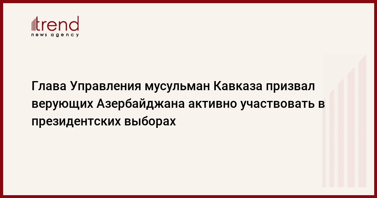 Азербайджан, Баку, 30 августа /корр. Trend С.Кязымлы/ Глава Управления мусульман Кавказа Шейхульислам гаджи Аллахшукюр Пашазаде призвал верующих Азербайджана активно участвовать в президентских выборах.