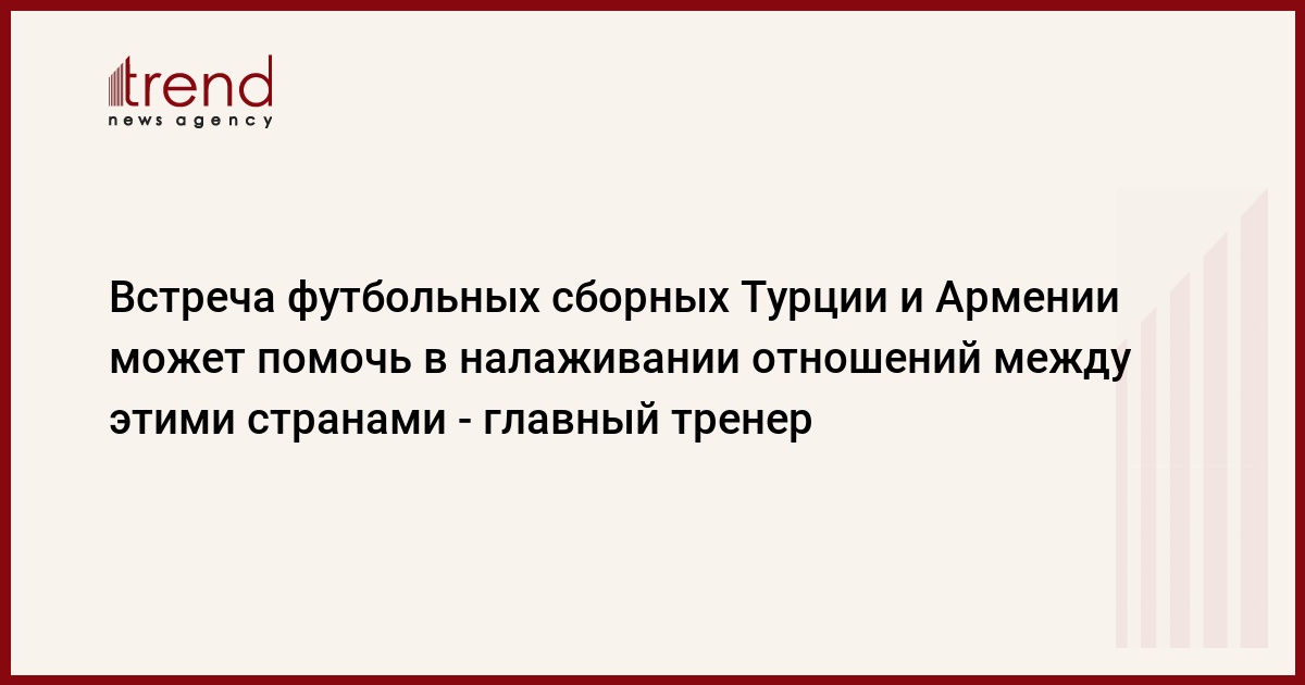 Азербайджан, Баку, 2 сентября /корр. Trend News Р.Эргюн/ Как считает главный тренер сборной Турции по футболу Фатих Терим, матч между командами Турции и Армении, который пройдет 6 сентября, в положительном плане повлияет на отношения этих стран. "Встреча с Арменией на футбольной арене может послужить хорошим шагом в направлении налаживания отношений между двумя странами", - сказал Терим на проведенной во вторник пресс-конференции.