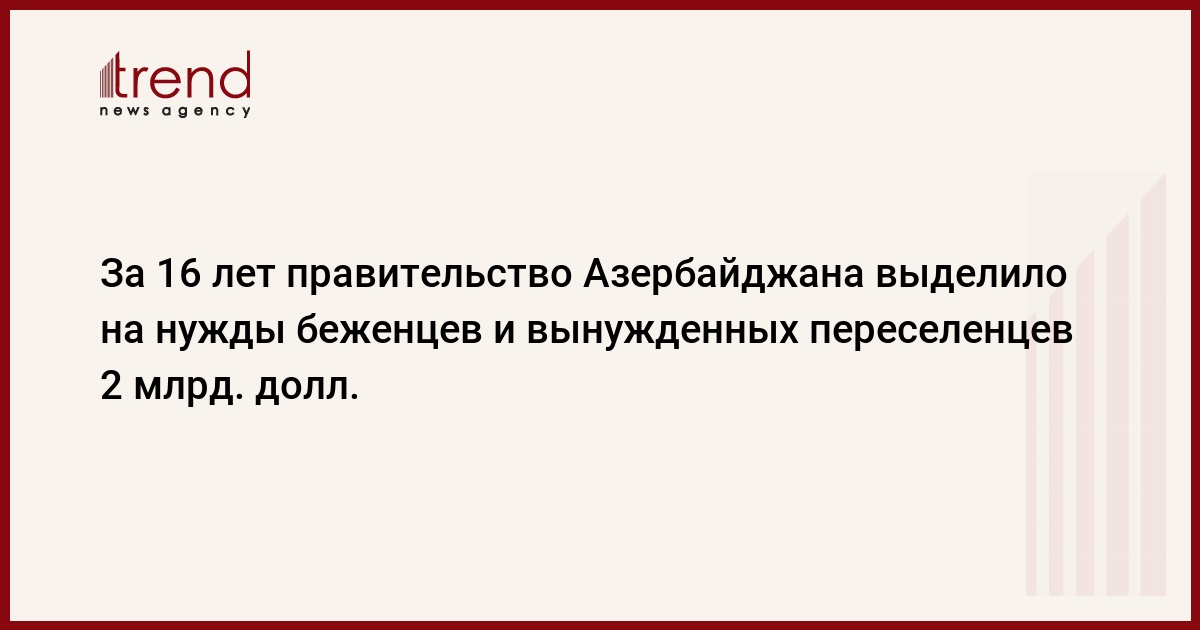 За 16 лет правительство Азербайджана потратило на беженцев и вынужденных переселенцев средств на сумму два миллиарда долларов, сказал заместитель премьер-министра, председатель Госкомитета по работе с беженцами и вынужденными переселенцами Азербайджана Али Гасанов на мероприятии, посвященном Международному дню беженцев.