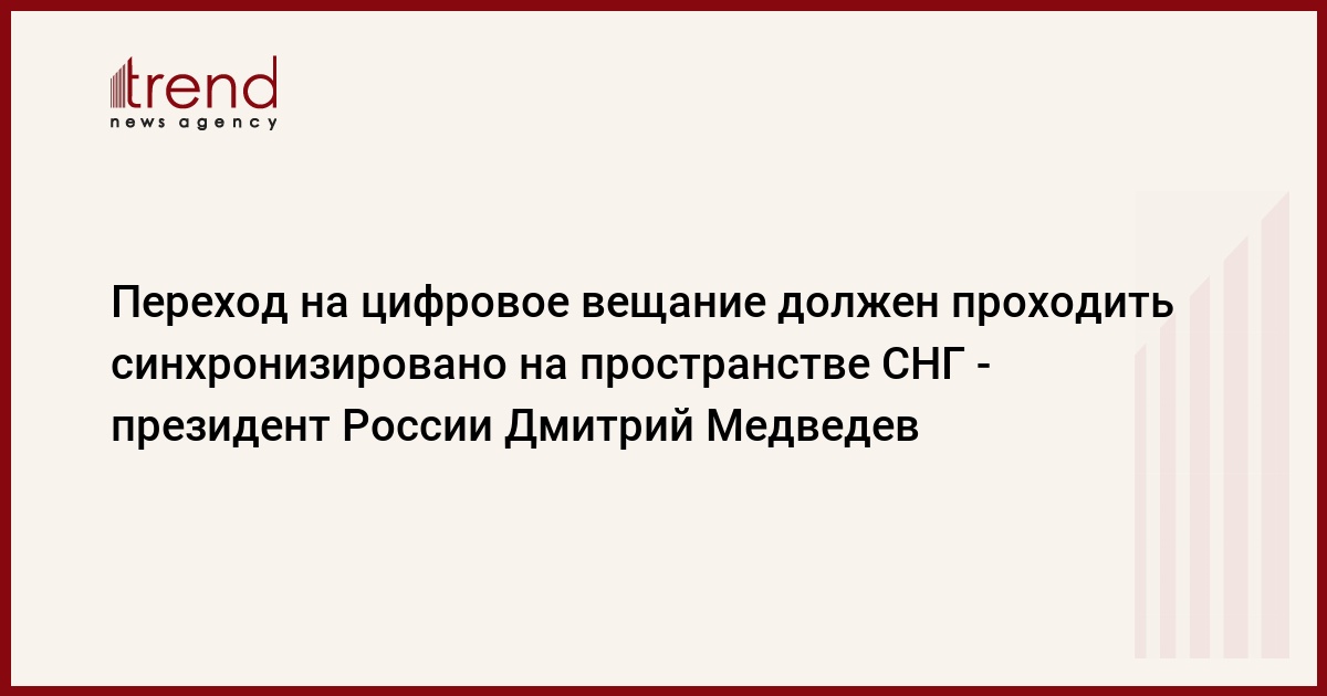 Россия к 2015 году перейдет на цифровое вещание, и этот процесс должен проходить синхронизировано с государствами СНГ, сказал сегодня на форуме европейских и азиатских медиа президент России Дмитрий Медведев.