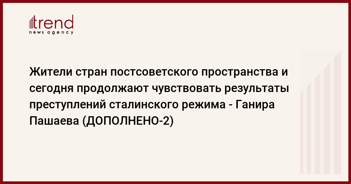 Жители стран постсоветского пространства и сегодня продолжают чувствовать результаты преступлений сталинского режима, сказала член делегации Азербайджана в ПАСЕ, депутат Милли Меджлиса Ганира Пашаева на обсуждениях доклада председателя ПАСЕ Мовлута Чавушоглу, посвященного жертвам Голодомора.