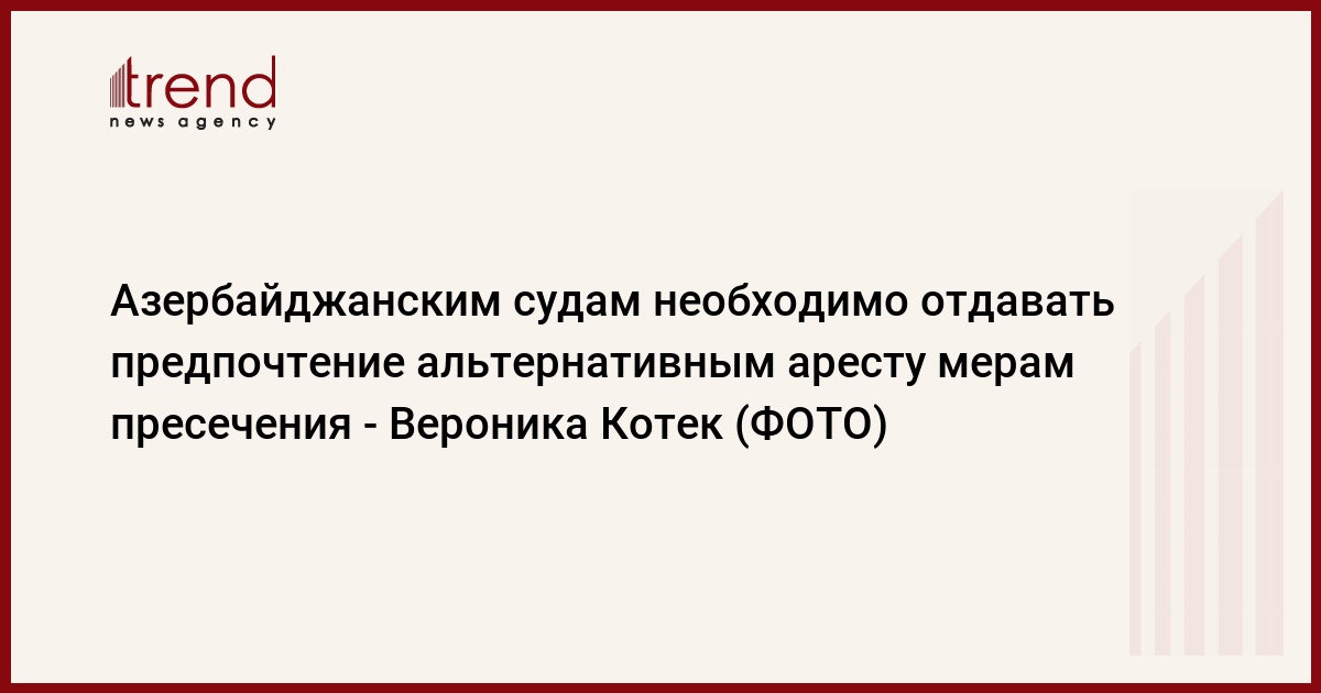 Азербайджанским судам необходимо отдавать предпочтение альтернативным аресту мерам пресечения, сказала в четверг глава представительства СЕ в Азербайджане Вероника Котек на мероприятии, посвященном итогам совместного проекта СЕ и министерства юстиции "Поддержка тюремным реформам".