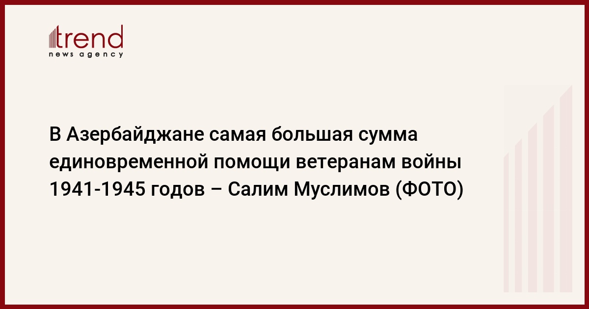 "В Азербайджане самая большая сумма единовременной материальной помощи, предоставленной государством ветеранам Великой Отечественной войны. Например, если взять в азербайджанских манатах, в Казахстане эта сумма составила около 357 манатов, Украине - 100 манатов, Беларуси - 135 манатов, а в России - 138 манатов", - сказал председатель ГФСЗ Салим Муслимов.