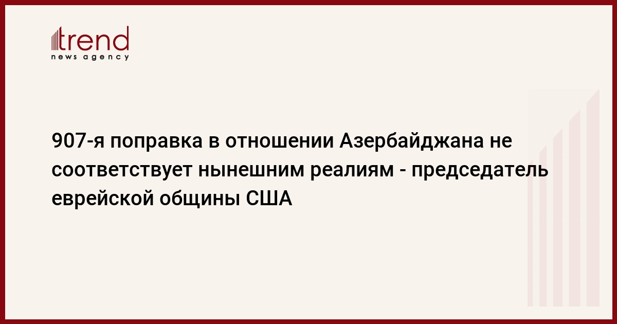 907-я поправка Конгресса США в отношении Азербайджана не соответствует нынешним реалиям, сказал журналистам в воскресенье председатель еврейской общины США Дэвид Харрис.