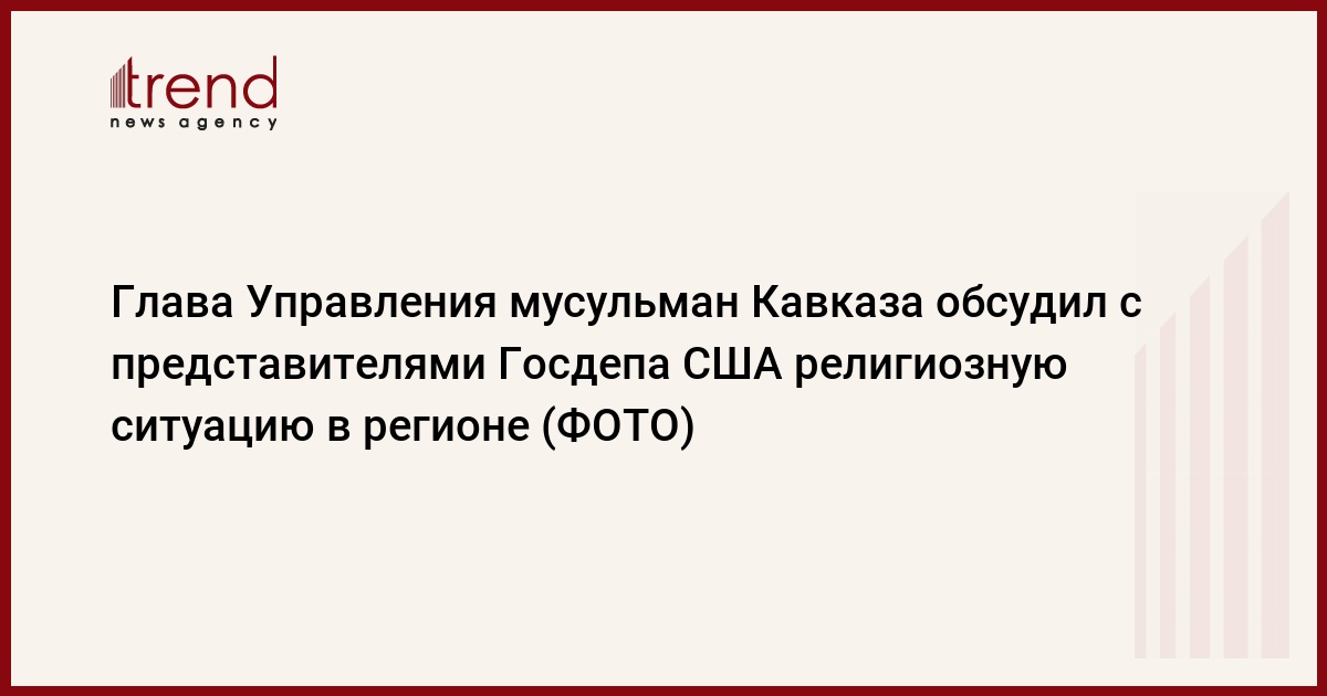 Глава Управления мусульман Кавказа шейхульислам гаджи Аллахшукюр Пашазаде провел встречу с представителями Госдепа США. На встрече присутствовали посол США в Азербайджане Мэтью Брайза, спецпредставитель Госдепа США по работе с мусульманскими общинами Фарах Пандит, спецпредставитель Госдепа США по мониторингу и борьбе с антисемитизмом Ханна Розенталь.