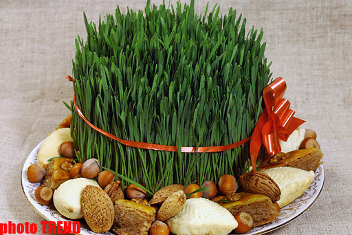 Азербайджанцы очень внимательно относятся к праздничному столу. На столе должны быть семь блюд, начинающихся на букву "с", а также сумах (сушеный барбарис), уксус, молоко, сэмэни (сладкая похлебка из пшеничного солода с мукой), сябзи (зелень) и др. Кроме этого на стол ставятся зеркало и свечи, перед зеркалом - покрашенные яйца. Это тоже имеет символическое значение: свеча означает огонь, свет, который оберегает людей от сглаза, зеркало символизирует ясность, прояснение.