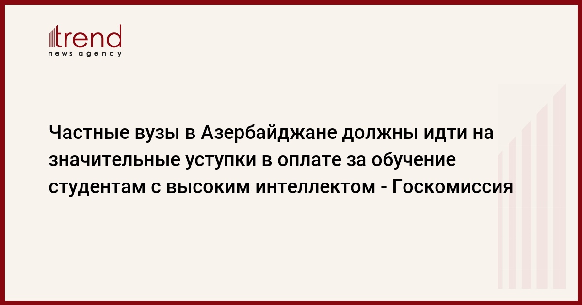Частные вузы в Азербайджане должны предоставлять существенные льготы на плату за обучение для студентов с высоким уровнем интеллекта. Об этом сказала в среду на мероприятии, посвященном научно-статистическим итогам за 2012/13 учебный год, председатель Госкомиссии по приему студентов (ГКПС) Малейка Аббасзаде.