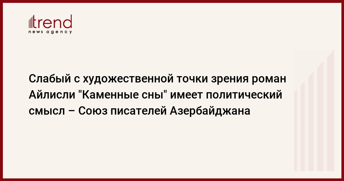 После обсуждения было принято заявление союза в связи с данным произведением. В заявлении, поступившем в Trend из организации, говорится, что на днях ряд представителей общественности и представители медиа обратились к руководству СПА с целью узнать отношение к роману Акрама Айлисли "Каменные сны", опубликованном в журнале "Дружба народов" (№12, 2012).