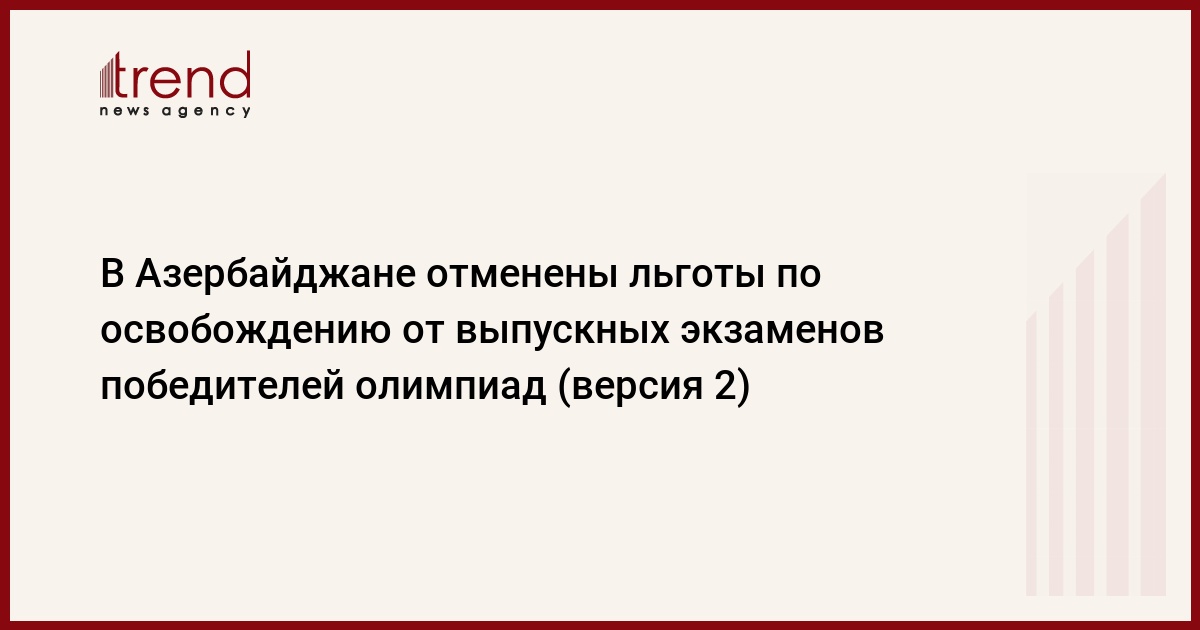 В Азербайджане отменены льготы по освобождению от выпускных экзаменов выпускников средних школ, которые являются победителями Республиканской предметной олимпиады, сообщили Trend в пятницу в Госкомиссии по приему студентов (ГКПС).
