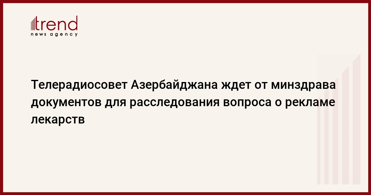 Национальный совет Азербайджана по телевидению и радиовещанию ожидает от минздрава документы для расследования вопроса о рекламе продаваемых без рецептов лекарств и частных клиник, имеющих право на рекламу, сказал в четверг журналистам председатель совета Нуширеван Магеррамли.