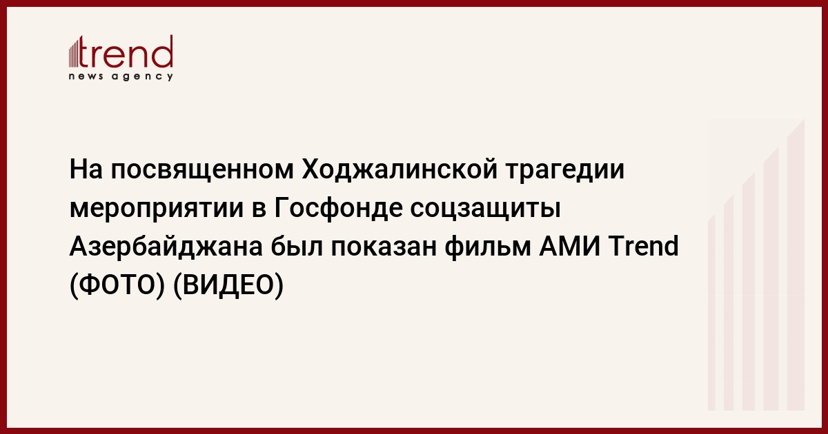 На мероприятии, посвященном 22-й годовщине Ходжалинского геноцида, прошедшем в Государственном фонде социальной защиты населения (ГФСЗ) Азербайджана, был продемонстрирован документальный фильм Информационного агентства Trend. Об этом сообщили Trend в понедельник в ГФСЗ.