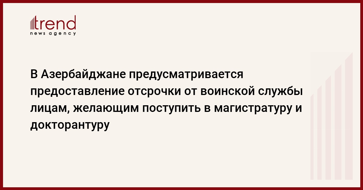 В Азербайджане предусматривается предоставление отсрочки от воинской службы лицам, желающим поступить в магистратуру и докторантуру. Об этом сказал в пятницу журналистам председатель комитета по науке и образованию Милли Меджлиса (парламент) Азербайджана Шамсаддин Гаджиев.