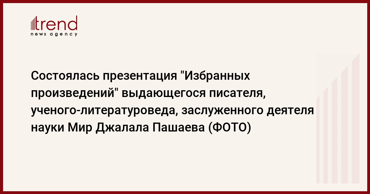 30 апреля в Азербайджанской национальной библиотеке имени М.Ф.Ахундзаде состоялась церемония презентации "Избранных произведений" (в 5-ти томах) выдающегося представителя азербайджанской прозы ХХ века, ученого-литературоведа, заслуженного деятеля науки Мир Джалала Пашаева.