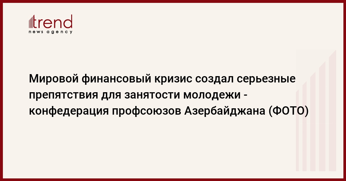 Мировой финансовый кризис создал серьезные препятствия для занятости молодежи. Об этом сказал в понедельник председатель Конфедерации профсоюзов Азербайджана, депутат Саттар Мехбалыев во время выступления на семинаре на тему "Роль профсоюзов в формировании политики занятости молодежи", организованном Конфедерацией и Международной организацией труда (МОТ).