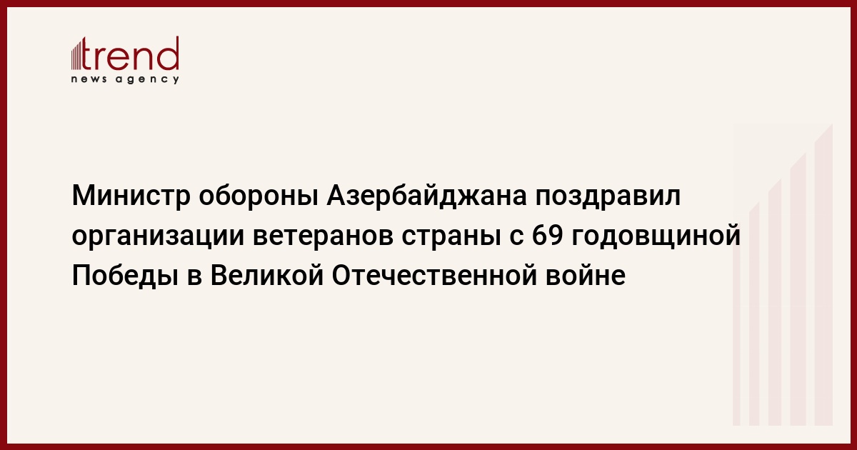 Министр обороны, генерал-полковник Закир Гасанов в четверг поздравил все организации ветеранов с 69-ой годовщиной Победы над фашизмом в Великой Отечественной войне, сообщили Trend в пресс-службе минобороны.