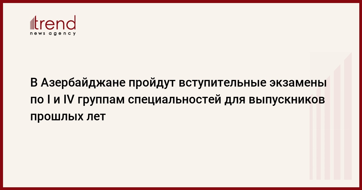 18 мая в Азербайджане будут проведены приемные экзамены по I и IV группам специальностей для выпускников прошлых лет, желающих поступить в высшие и средне-специальные учебные заведения (ссузы) на базе полного (среднего) образования. Об этом сказала на пресс-конференции в четверг председатель Государственной комиссии по приему студентов Азербайджана (ГКПС) Малейка Аббасзаде.