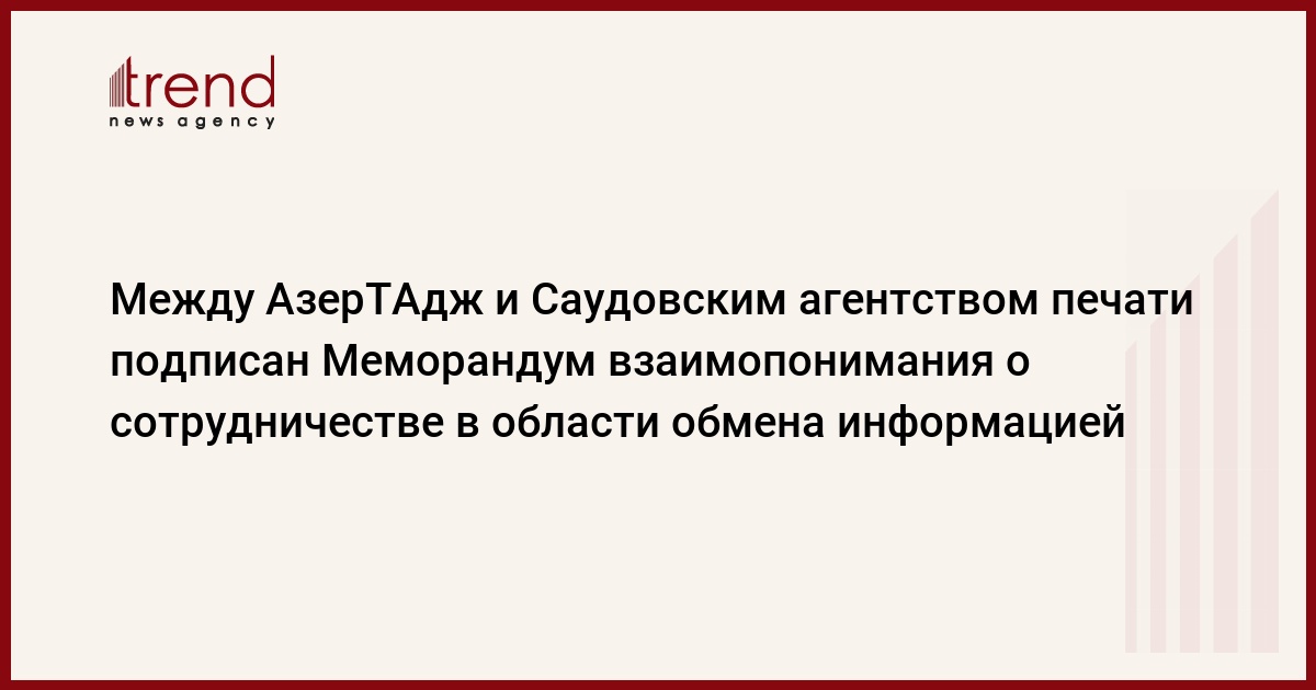 В рамках предстоящего в Баку заседания Совета Всемирного конгресса новостных агентств 30 мая между АзерТАдж и Саудовским агентством печати (СПА) Королевства Саудовской Аравии был подписан Меморандум взаимопонимания о сотрудничестве в области обмена информацией.