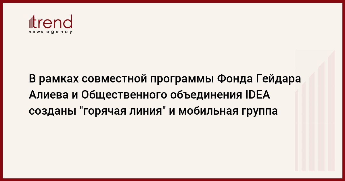 В рамках совместной программы "Нет вырубке деревьев!" Фонда Гейдара Алиева и Общественного объединения IDEA, инициированной вице-президентом Фонда Гейдара Алиева, учредителем и руководителем Общественного объединения IDEA (Международный диалог во имя охраны окружающей среды) Лейлой Алиевой с целью решения актуальных экологических проблем и усиления общественно-экологического контроля среди населения, созданы "горячая линия" "Скорая помощь природе" и мобильная группа. Об этом говорится в пятницу в сообщении Общественного объединения IDEA.
