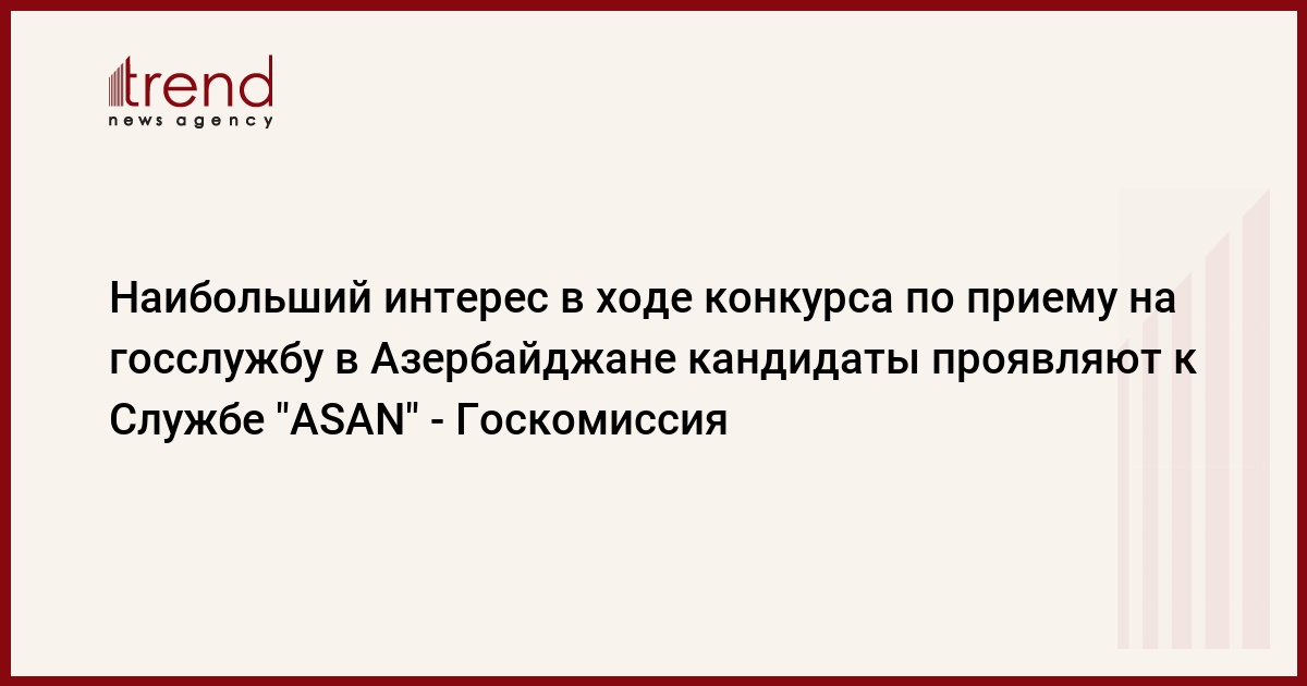 БАКУ /Trend/ - Наибольший интерес в ходе конкурсов, которые проводятся в Азербайджане по приему на государственную службу, кандидаты проявляют к работе в Службе "ASAN". Об этом говорится в сообщении пресс-службы Государственной комиссии по вопросам государственной службы при Президенте Азербайджана, распространенном в пятницу.