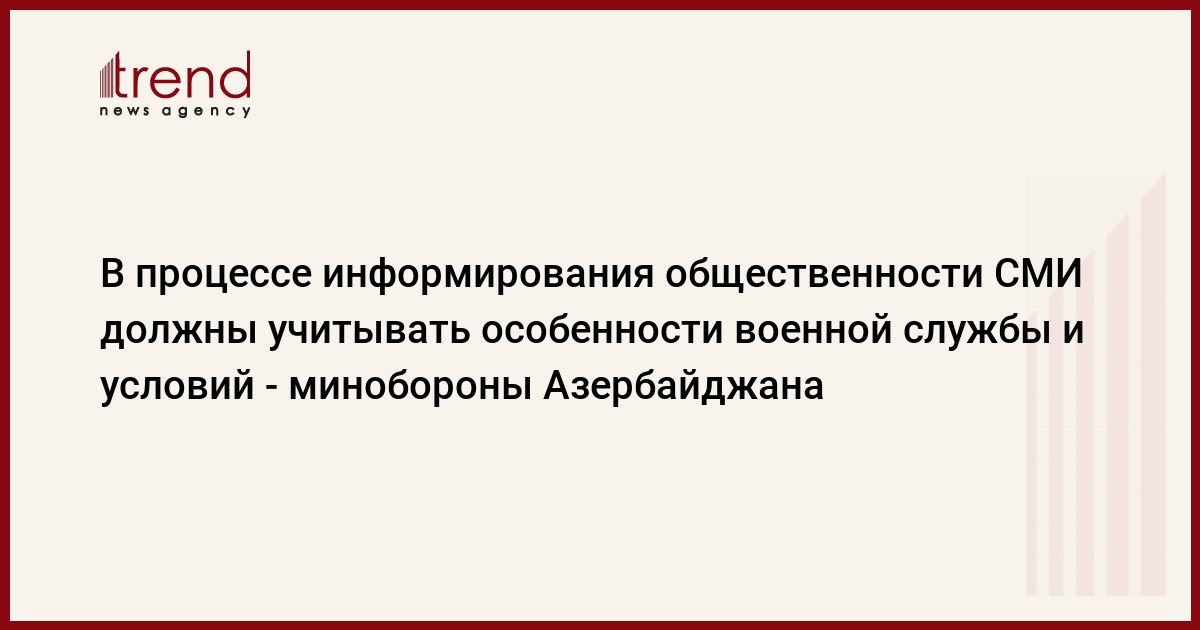 БАКУ /Trend/ - В процессе передачи информации необходимо обязательно учитывать особенности воинской службы и военных условий, то, что министерство обороны является закрытой структурой, а также ряд других факторов. Мы являемся сторонниками здоровой критики, правильных замечаний, ратуем за ответственность и профессионализм, но в вопросе освещения деятельности армии недопустимы предвзятость, ненависть и несогласованность.