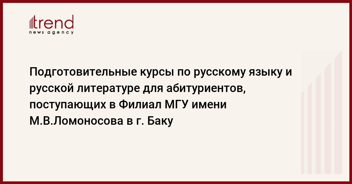 Объявляется прием на подготовительные курсы по русскому языку и русской литературе для абитуриентов, поступающих в Филиал МГУ имени М.В.Ломоносова в г. Баку. Занятия будут проводиться профессорско-преподавательским составом МГУ им. М.В.Ломоносова.