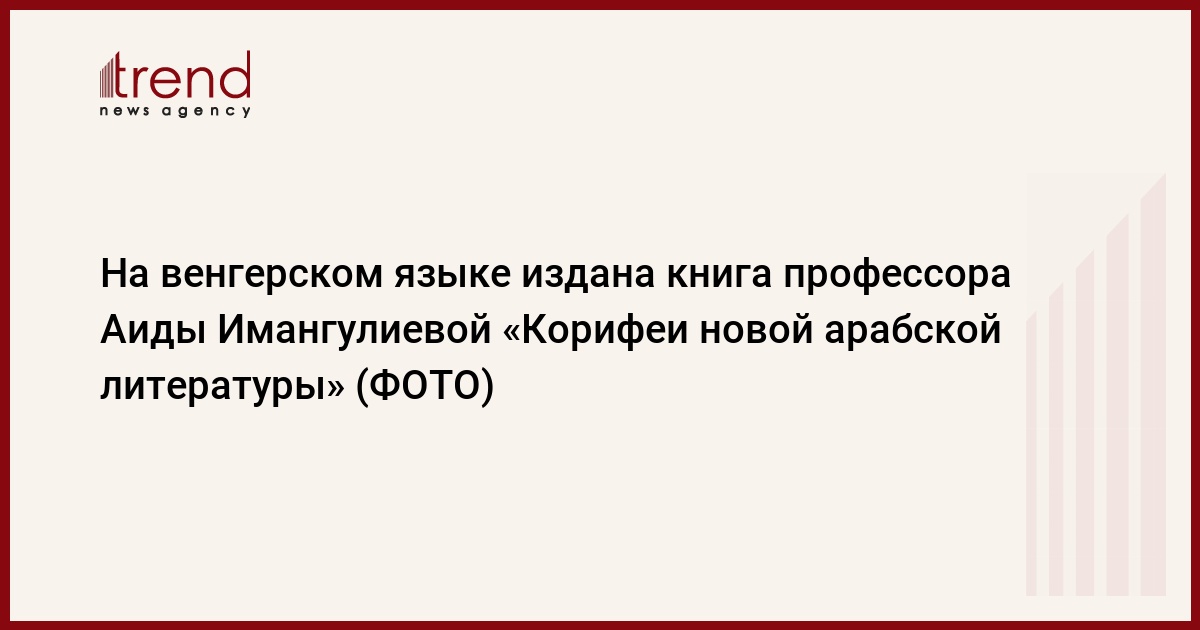 БАКУ /Trend/ - Книга видного ученого-востоковеда, общественного деятеля и организатора науки, первой женщины - доктора наук в сфере востоковедения в Азербайджане, профессора Аиды Имангулиевой "Корифеи новой арабской литературы" переведена на венгерский язык.